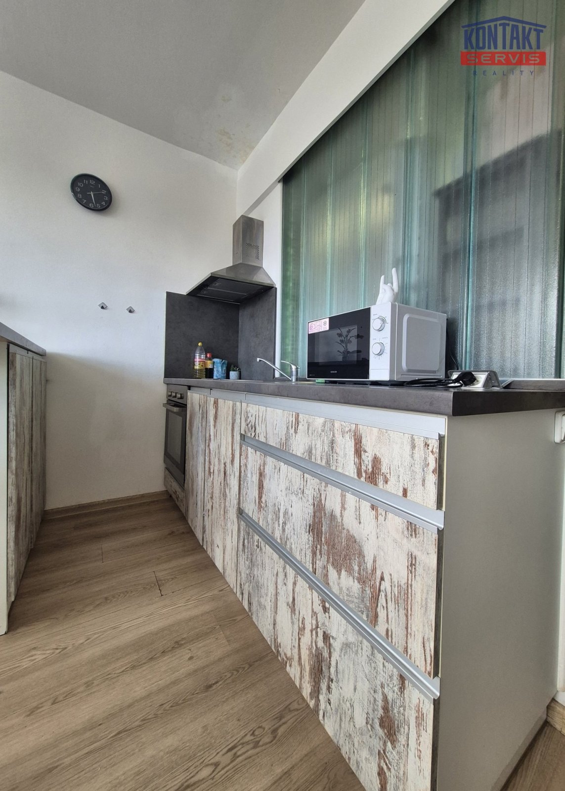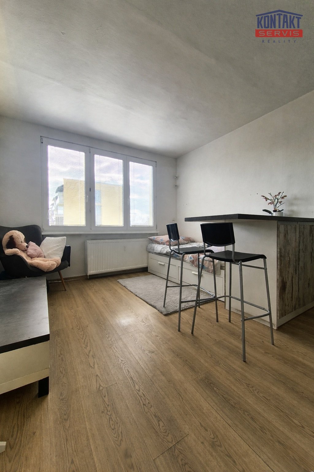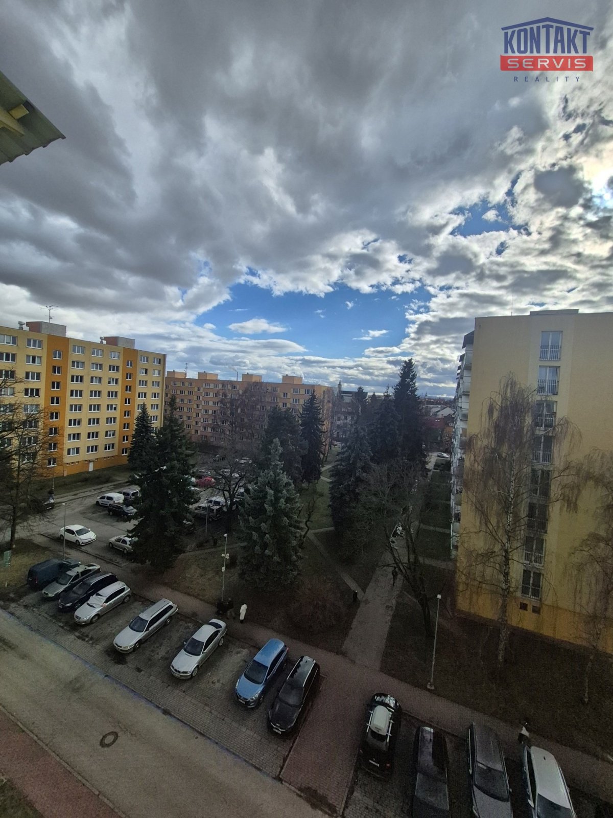Okno je orientováno směrem na Pekárenskou ulici s výhledem do parku a na obchodní centrum IGY.