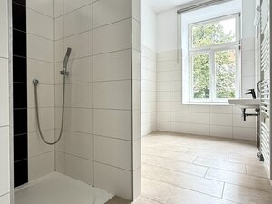 která nabízí vstup do elegantní koupelny s umyvadlem, sprchovým koutem a